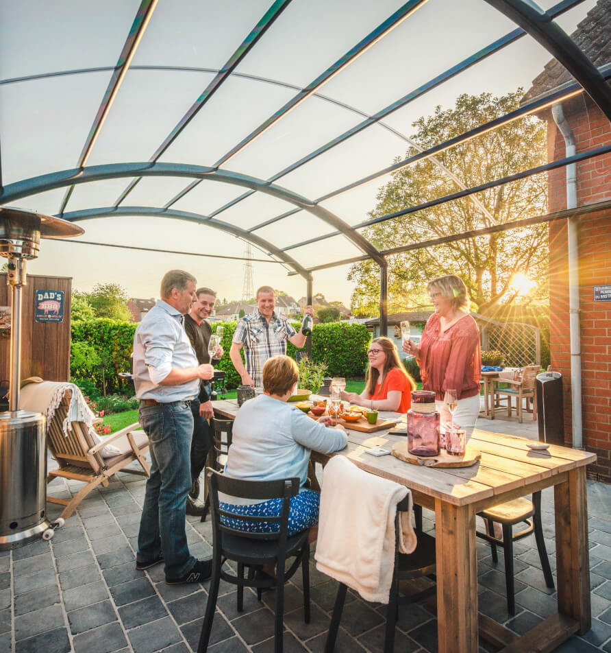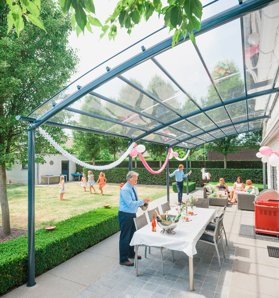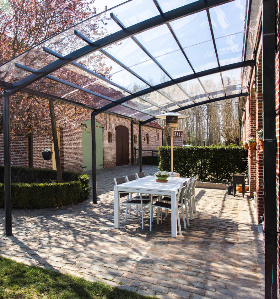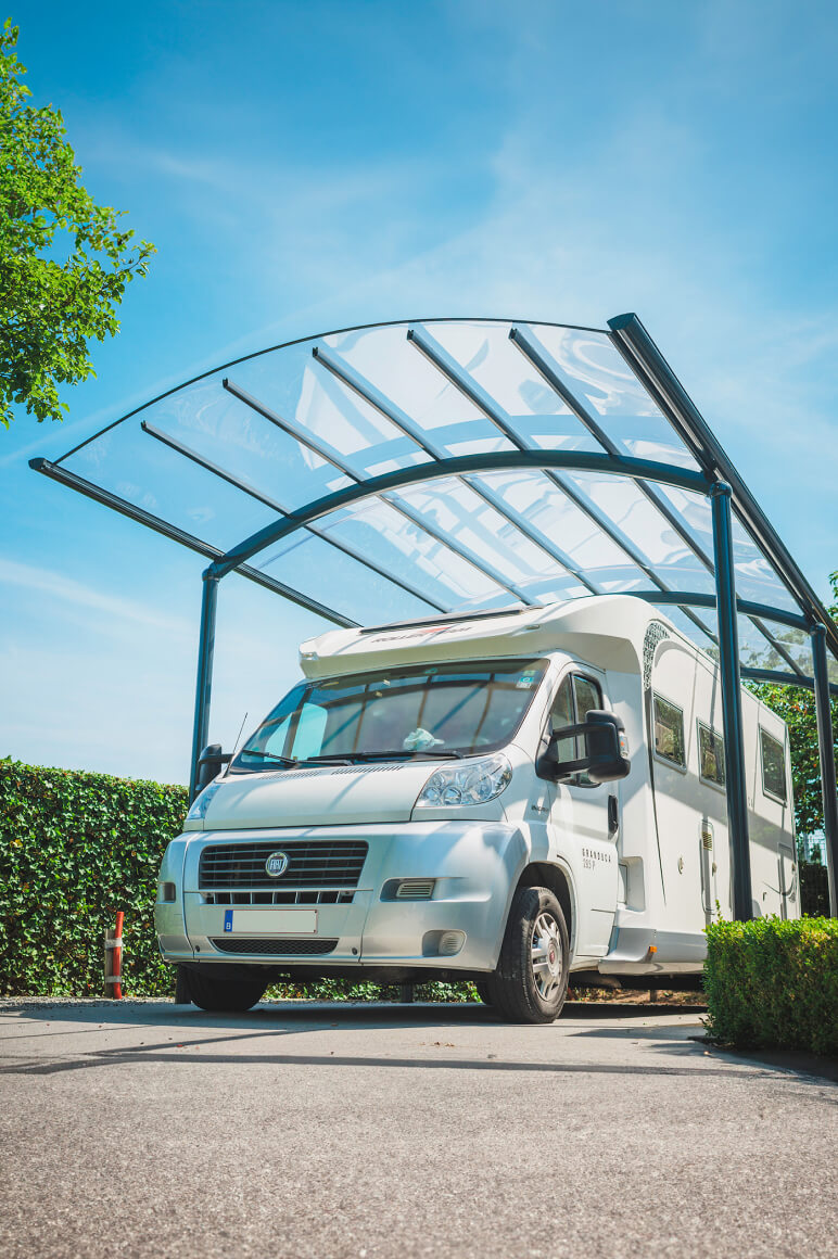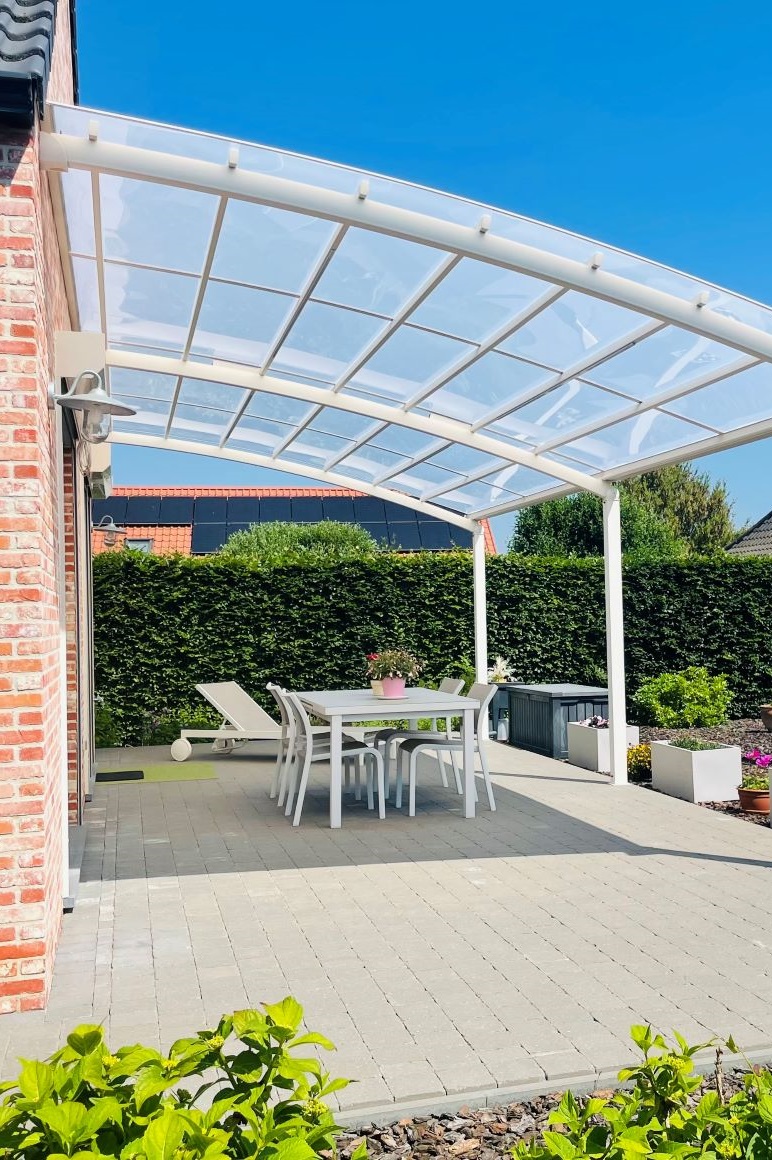 Aluminium overkappingen met een gebogen ontwerp voor een uniek ruimtegevoel op je terras, boven je auto en ook uitermate geschikt voor de bescherming van je mobilhome.
